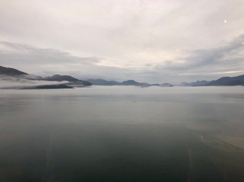 What a way to start the day! Last night the captain noted we’d reach Glacier Bay around 6am, so we dutifully woke up on time, and weren’t disappointed. And that’s despite the thick fog. One minute, everything’s crystal clear, then, quick as you like, you can’t see more than a few metres.