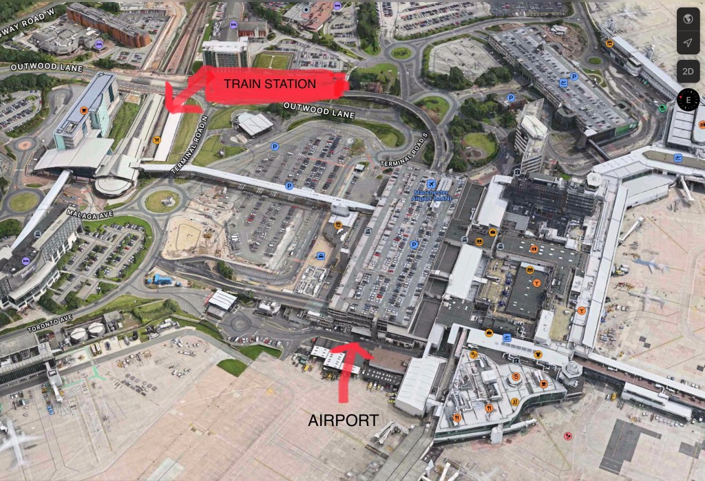 We worked our way through Manchester airport, which has a train station, which I thought would make things easy. I swear it was a half hour walk for slow old me, I felt deceived!