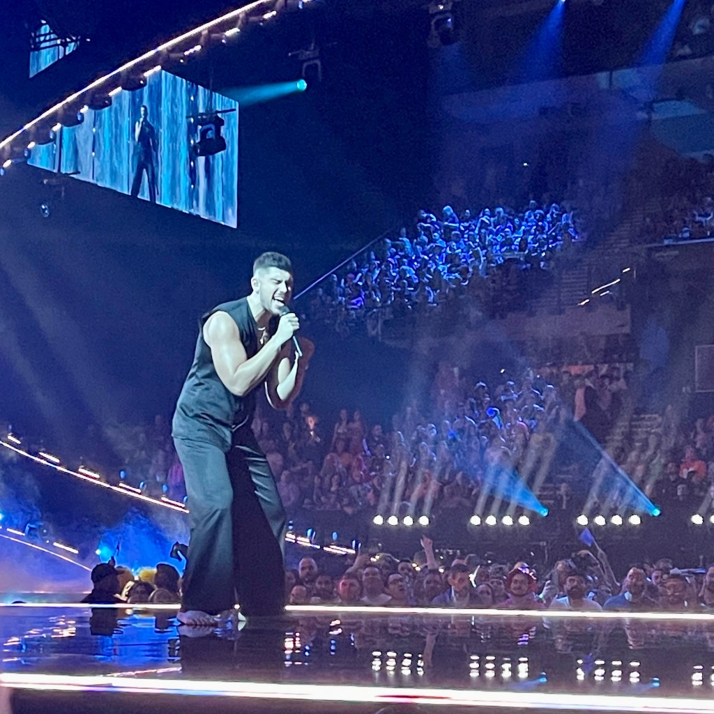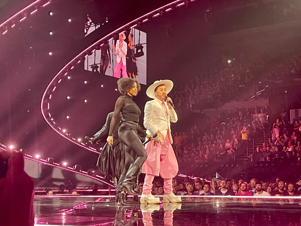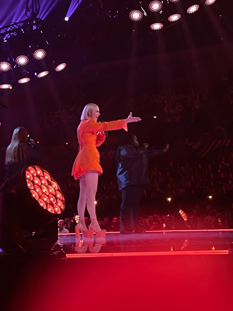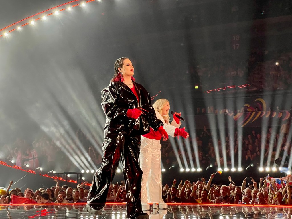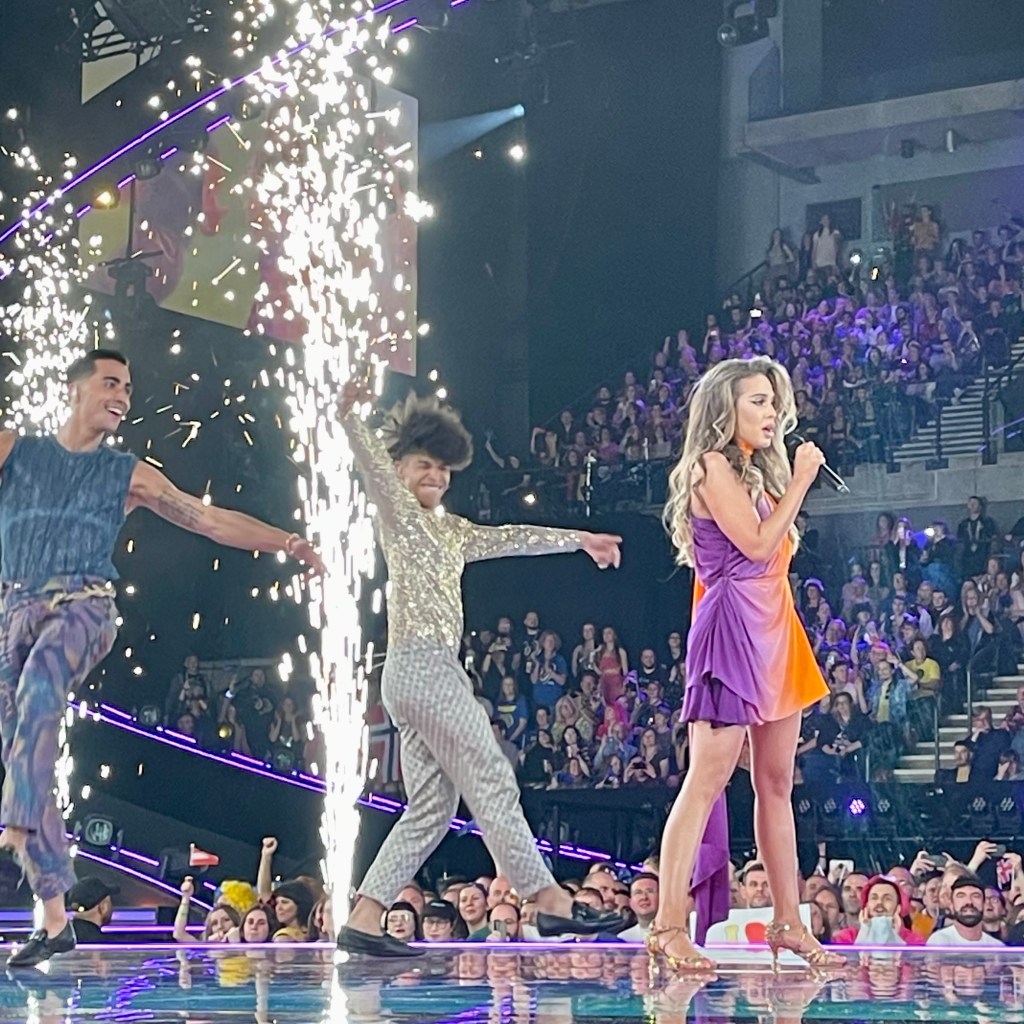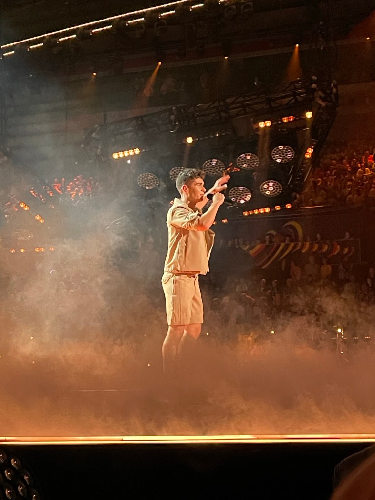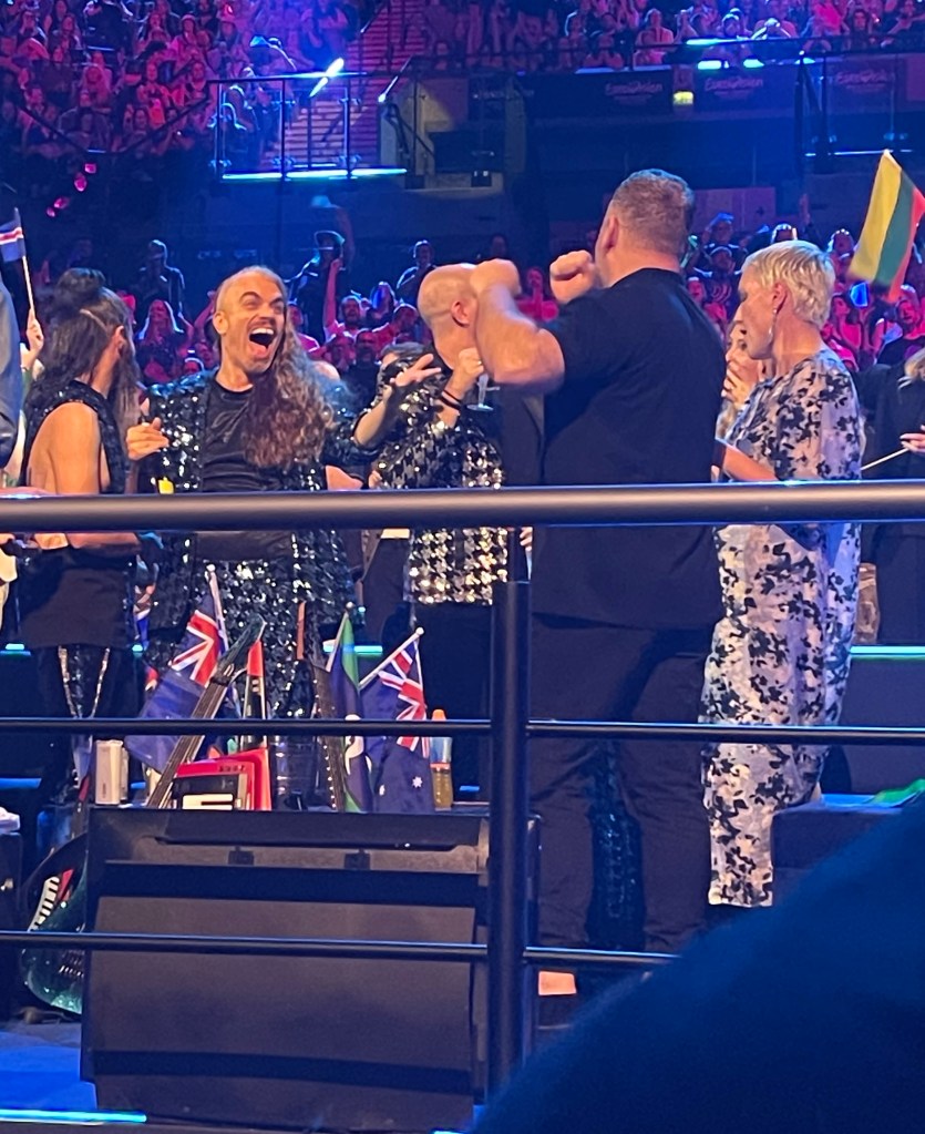 The last act to perform was Australia, and it was a thrill to see the whole crowd get very much into it singing along, and giving them an enormous cheer at the end, which was a really good sign. Then it was time for the voting to open and for the interval acts to start. They were the same as last night so I took this as my chance to get some water (I was parched as!), and then make my way to the back of the room where Perry was, hanging out right next to the Australian delegation’s Green Room area, to lend out support.. There were tons of aussies there this time including the bit of the Aussie Eurovision family we’d met before, which was great. The band appreciated us all being there too, stepping forward and saying hi to let us know they knew the fan base was there 🙂