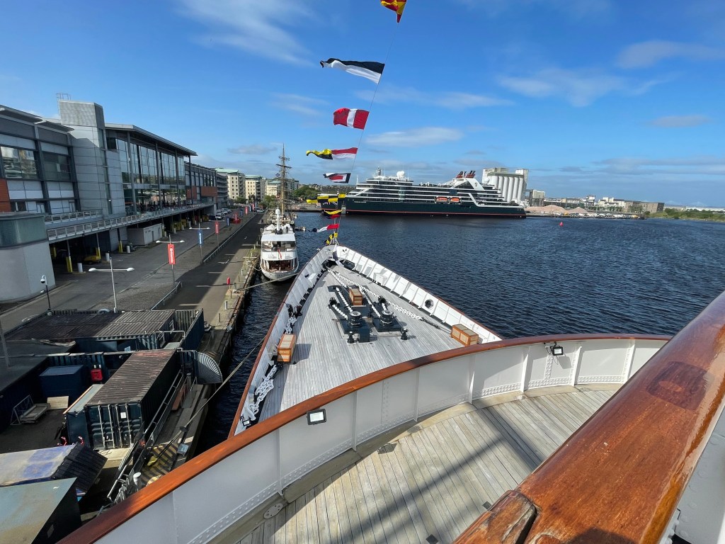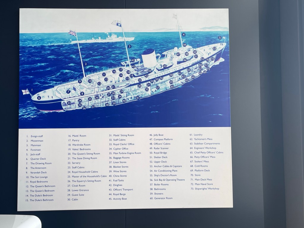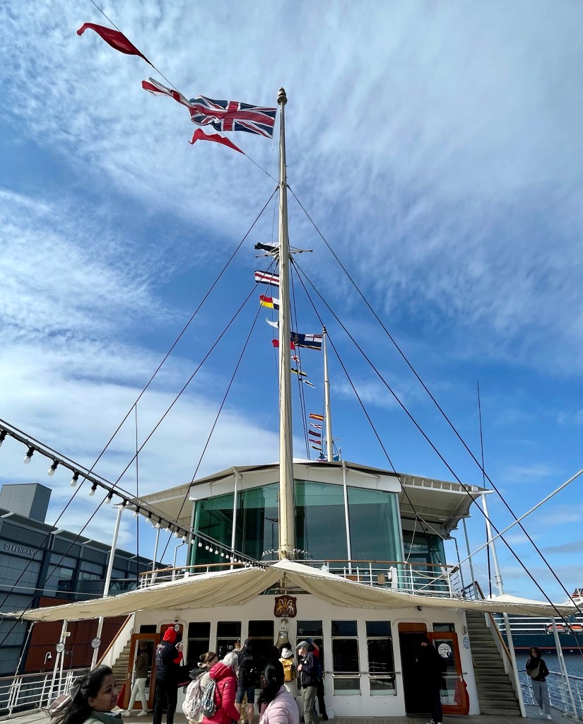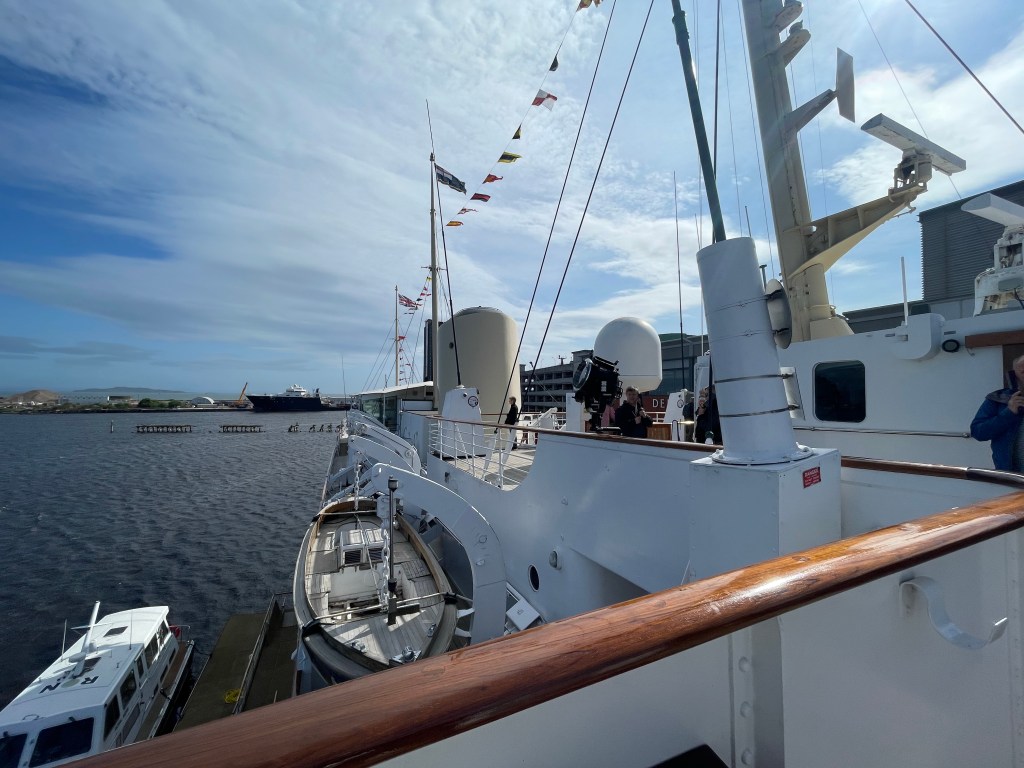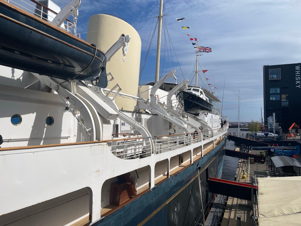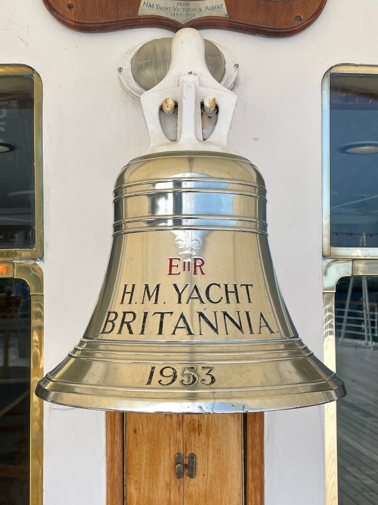 Suitably (and quickly) breakfasted, we went back up to old old friends the the Hop on Hop off bus as it goes right past this morning’s destination – the Royal Yacht Britannia. The Queen’s home-away-from-home when at sea, we’ve probably all seen it on the telly at some stage as she took it around and around the world. It was launched in 1953, and after 44 years at sea was decommissioned in 1997, bringing to an end the tradition of royal yacht starting around 1650.