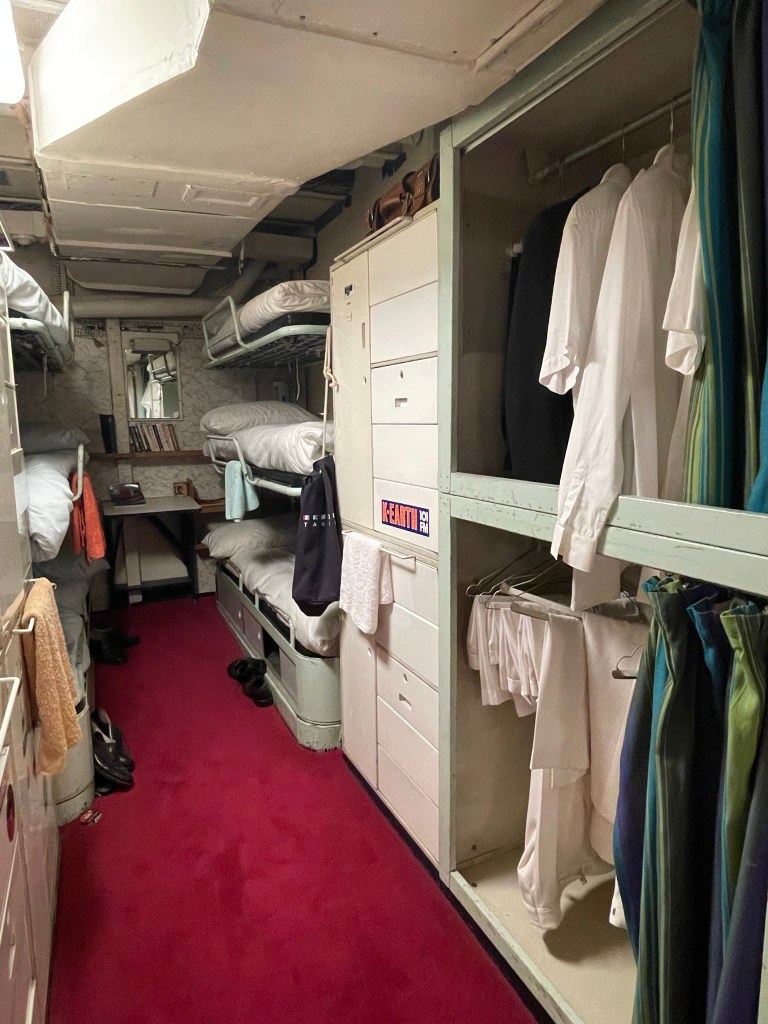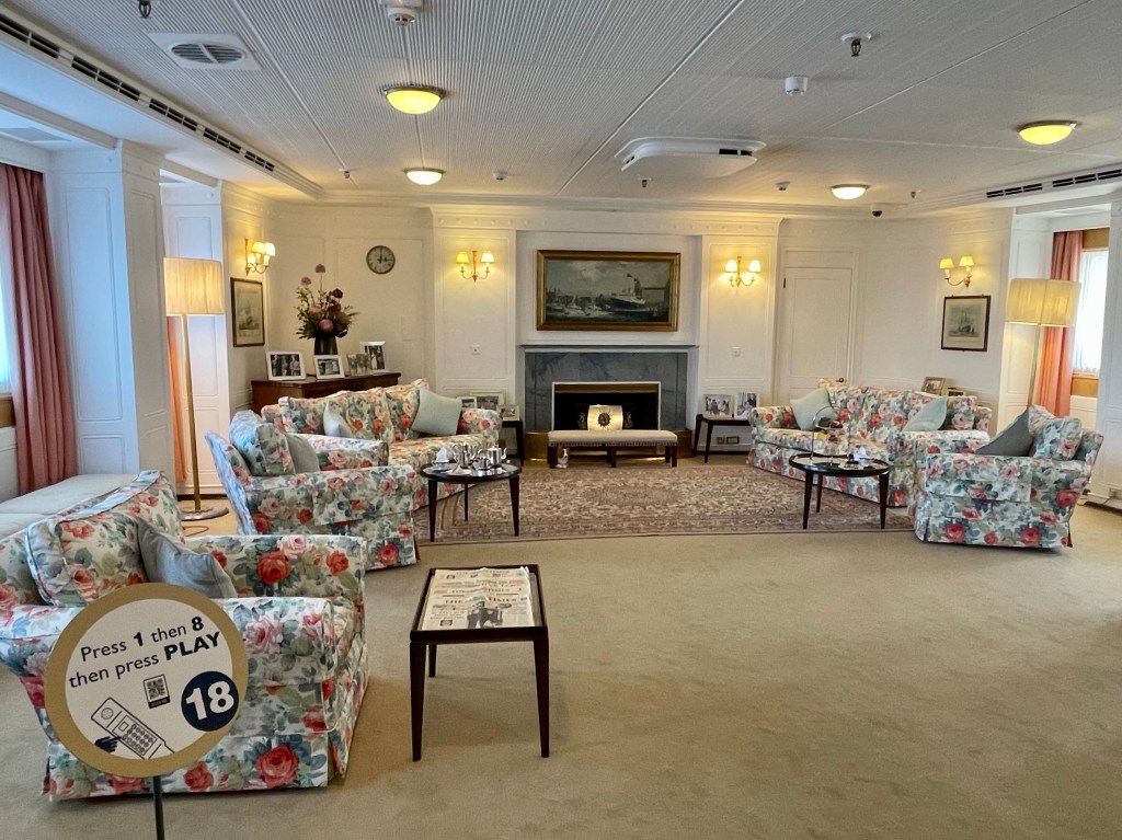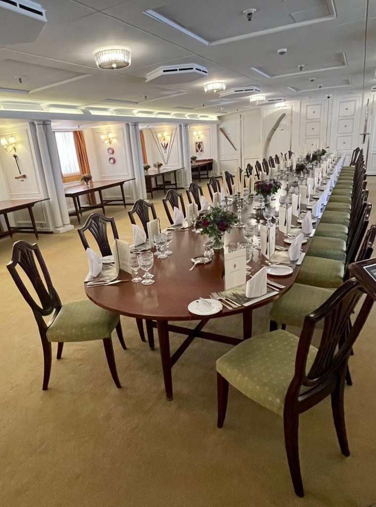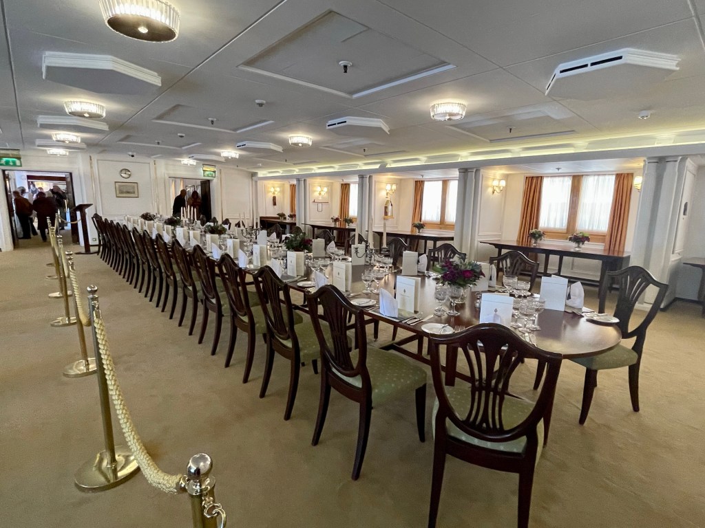 Things did get a bit more fancy in the formal dining room which I think could sit around 59 guests. The table could take up to 3 hours to set, with each piece of cutlery placed and checked with a ruler (like, not the Queen, I mean a measuring stick with numbers on 😉 ) . There were about 220 staff on board, I’m not sure if that included the people needed to keep it going or also the Queen’s staff as well. But I can imagine it wouldn’t exactly have been cheap to operate.