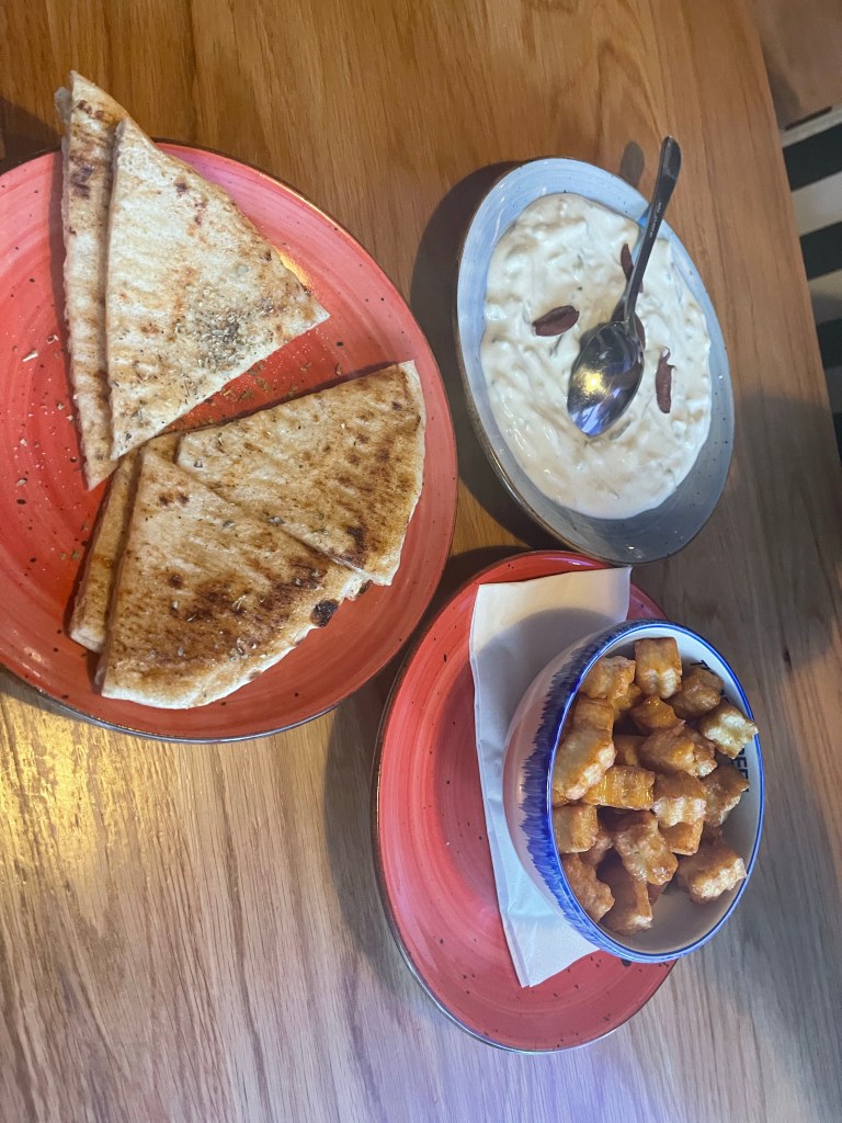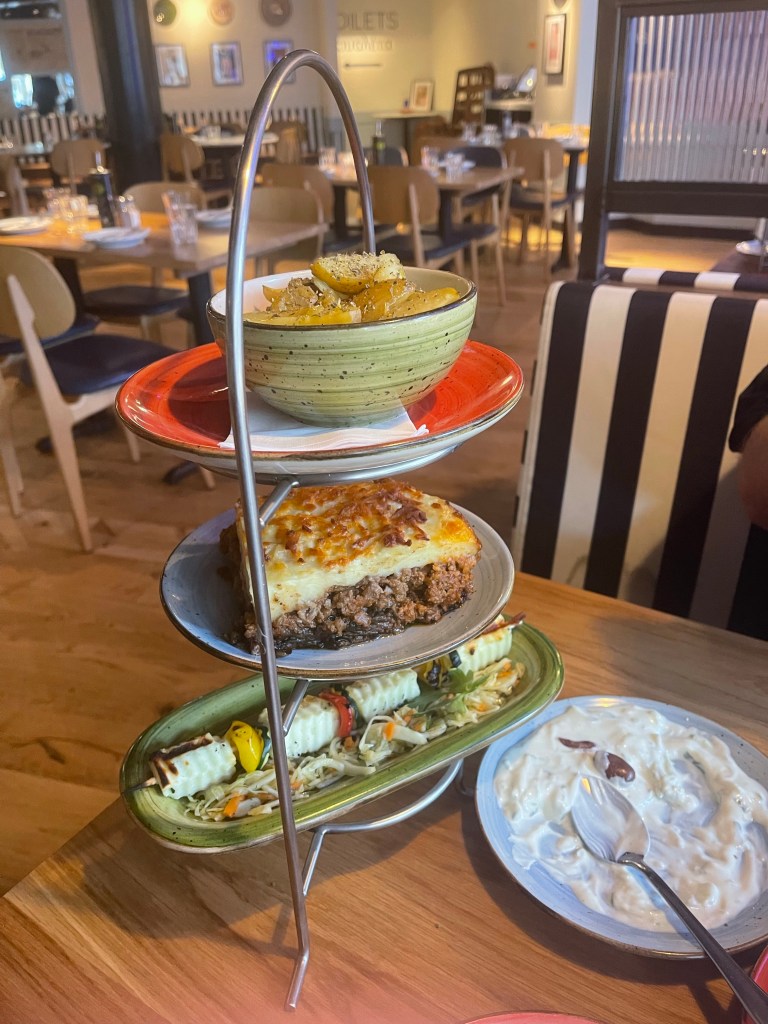 Dinner was in a nearby huge mall, St. James Quarter. Delicious Greek food – looks a bit like a high tea.