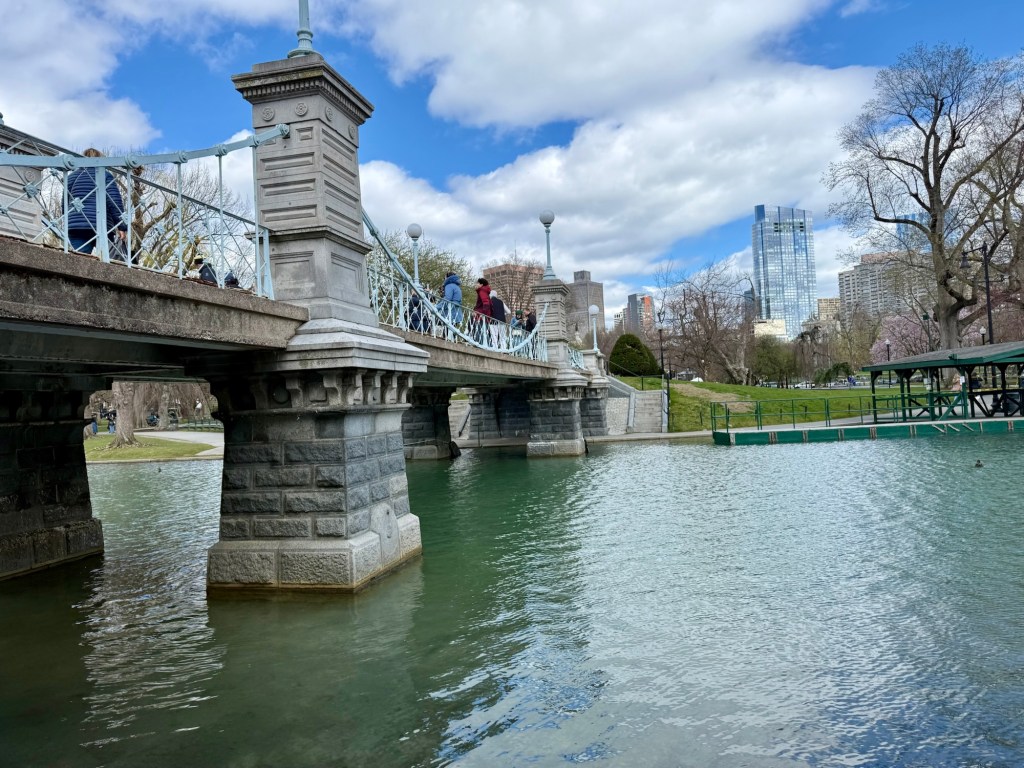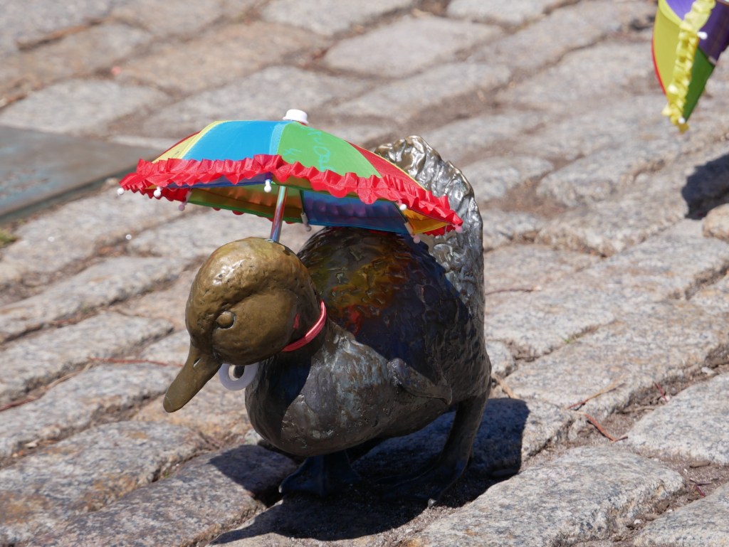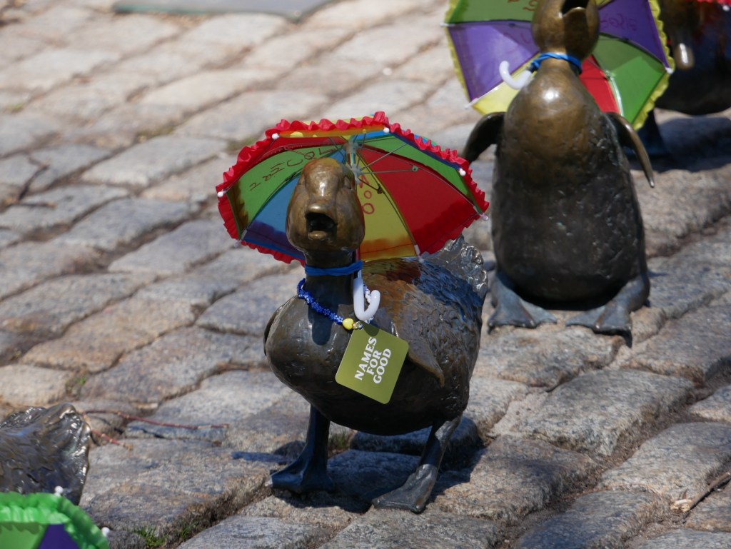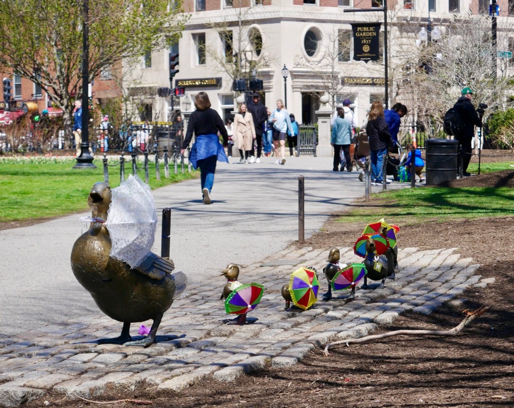 There is also a series of bronze ducks, from the apparently-famous children’s book “Make way for Ducklings” but Robert McCloskey. Apparently the ducks regularly get dressed up – when we were there, they all had parasols. Lovely.