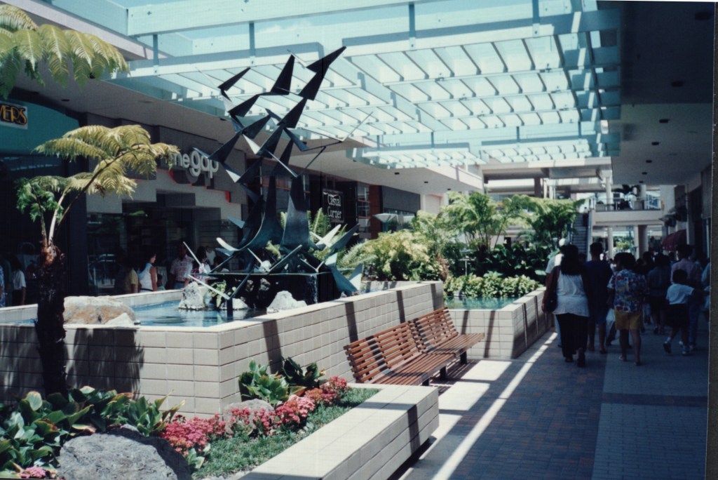 Anyway – where was I? Ala Moana, trying to get a before-and-after shot. Of course, it’s not just photography that has changed since the 90s, Ala Moana has too. The sculpture I’d taken a photo of, in all of its mid-century metal glory, has been removed, re-homed, and re-concreted. I’m grateful it’s still there at all, but alas no chance of a shot-for-shot remake of where it was. Here’s a rough approximation anyway.
