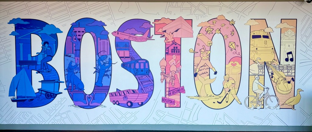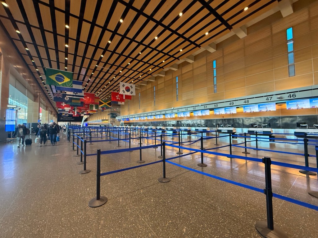 Boston’s Logan Airport is big, shiny modern, and did I mention big? There’s like 130 or so check-in desks in a massive hall – the whole place seems to everything at a huge scale.