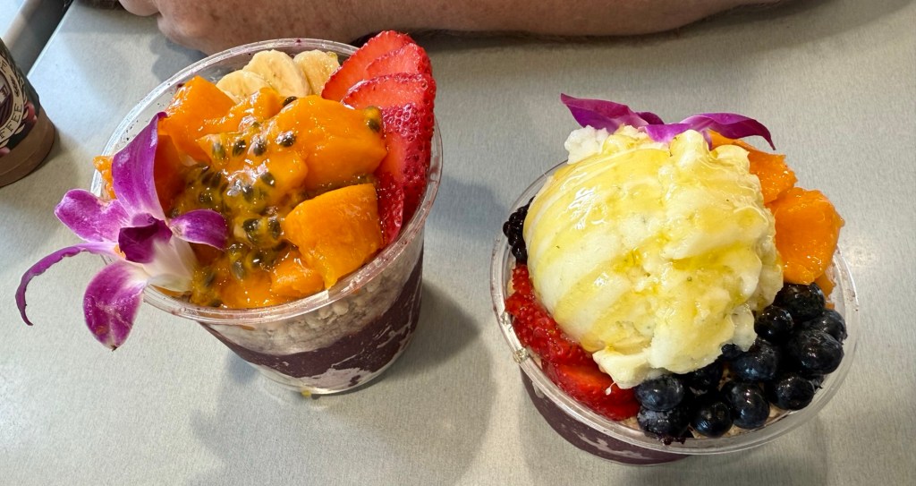So instead of a 21km run we opted for a much shorter walk to a Shaved Ice / Açai place for breakfast. They even had one of those very rare devices around these parts – an espresso machine! Mind you this was a machine that was only giving you a cappuccino if you forked out $6.95 USD for it, which at the moment is approximately $1000 Australian, give or take? 🙂 Whatever, all worth it for semi-decent cup, maybe a 7 on the iScott Coffee Scale at a pinch. The açai bowls were delicious to eat, and perhaps even more delicious to look at – beautifully presented with their abundance of fruit and a pretty flower to top it off.
