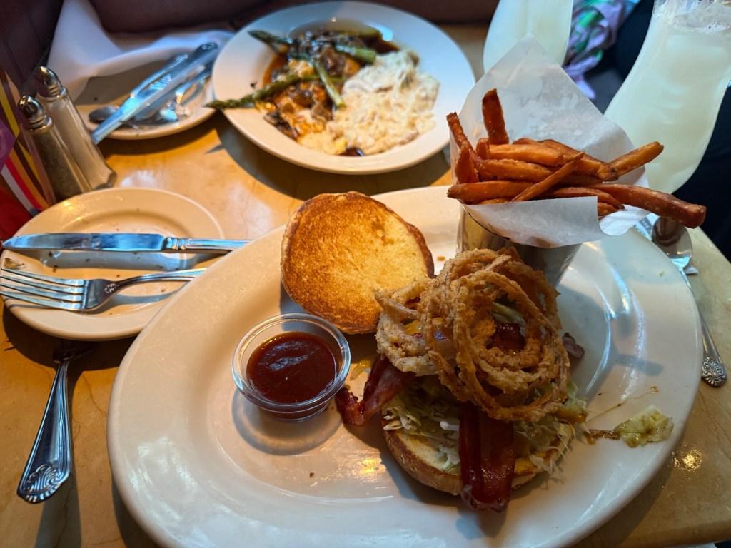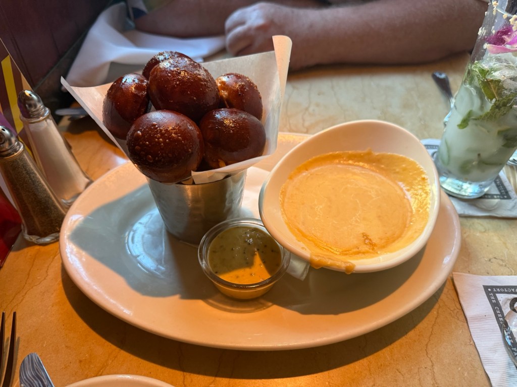 Just like last time we went 12 years ago, there was way too much choice and way too much food. But hey what a good problem to have. Starting with a Yuzu Drop and a Coconut Mojito, we had delicious Pretzel Bites with a cheddar fondue, followed by a Smokehouse Burger (for me) and a plate of delicious mushroomy Chicked Madeira (for Perry), washed down with delicious cold refreshing Coconut Limeade. Despite working in what must be an incredibly hectic and high pressure environment our server was all smiles, really helpful, and totally earned her generous tip. We finished off by realising there was no way we could fit in any cheesecake … which is exactly why we ordered some to take away back to the hotel.