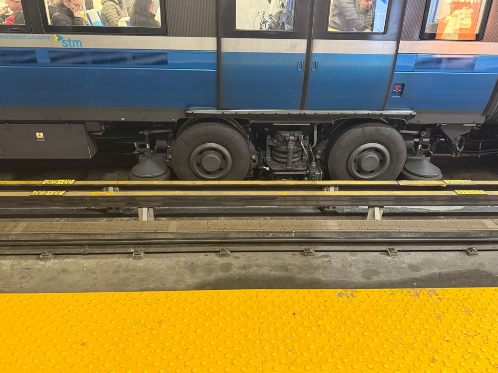 This morning it was about 5 degrees, the ‘feel like’ temperature was -3 on account of the wind. However by the time we headed out it wasn’t too bad at all with a jacket on. At this time we were again grateful that the bus driver from the airport didn’t let us use our transport card – they are active for 24 hours after first use and they hadn’t had their first use yet, so when we caught the train today, the 24 hours transport card worked a treat. (And because I’m a nerd, and future me will probably wonder what train we caught, we took Orange line from “Square Victoria – OCAI” to “Berri-UQAM” then changed to the green line, to “Pie IX” station. Which (because I am classy) sounded like “Penif” in every announcement. It’s Pie Neuf (Neuf being 9 in French of course). Anyway. It seems the Montreal Metro is modelled off the Paris Metro, as all the trains have rubber tyres (in addition to running on rails). I guess does make a bit quieter and the ride is a bit more comfortable, but yeah it sure is different. All the trains and station we saw were very clean and well maintained, no graffiti to be seen. Anyway, this means time for train/station photos..