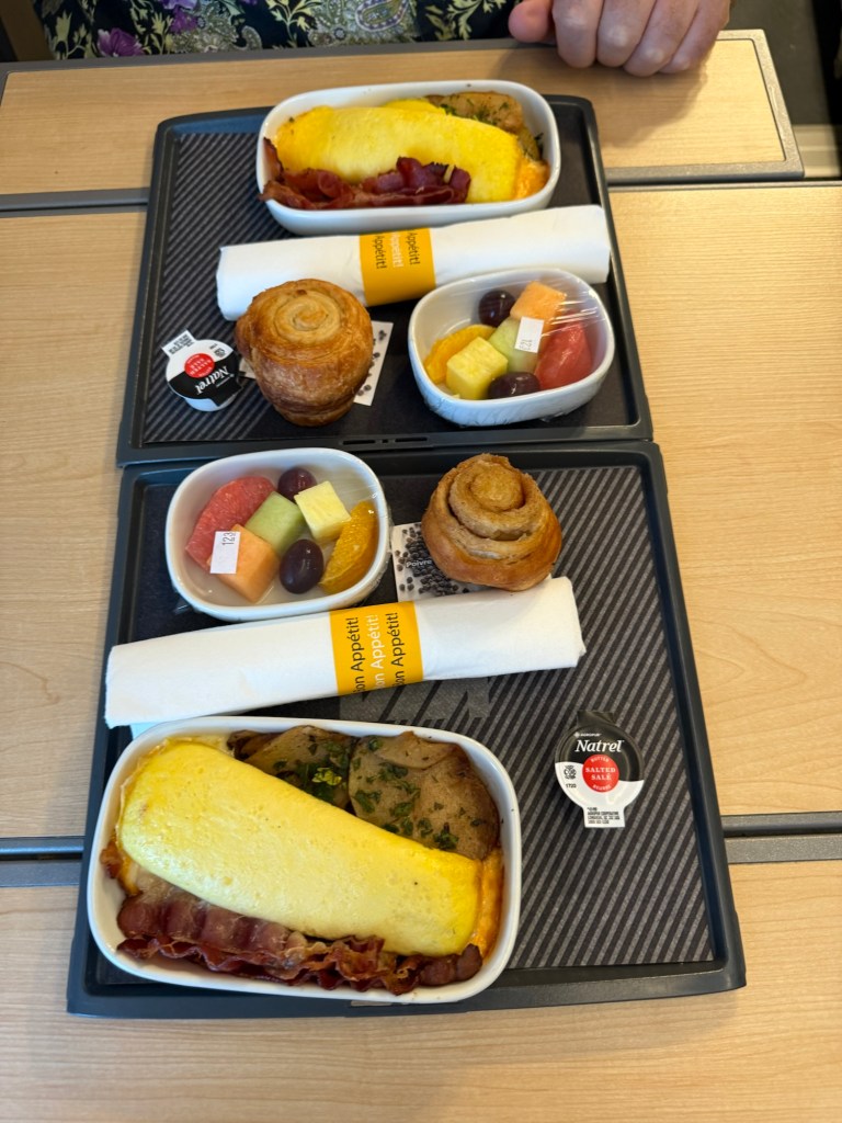 The staff were great – not too long after being underway tea/coffee/juice was served, and a bit after that, a tasty meal of a three-cheese omelette with bacon and potatoes, some fruit and a cinnamon bun. Really tasty!