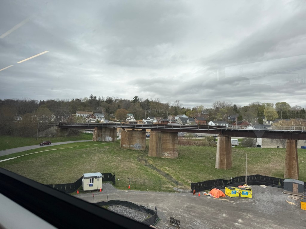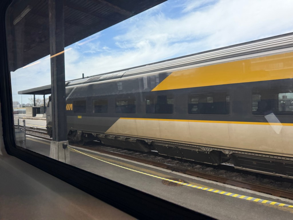 We boarded with our perfectly weight-distributed luggage, there was a ton of luggage space on the train which was great, then we took our seats. Yesterday Perry checked the seating map and noticed two table-seats facing each other had become available, so we shifted the booking to use those seats. Then when we boarded perhaps we learned why the seats were available. It was a bit like my flight from Hawaii to Boston – one of the seats had no window. I guess it was a trade-off – Perry gets to sit in the direction of travel but no window. I travel backwards but I have a view. Seems kinda fair?